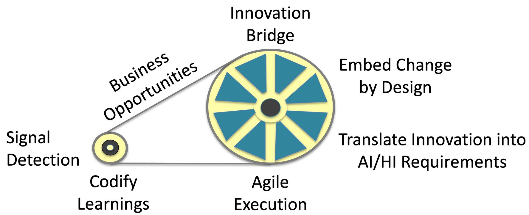 Flaiwheel℠ is a real-time Signal-to-Execution architecture that integrates market signals, translates data into actionable innovations, and enables sustainable transformation through behavioral design, multi-disciplinary team collaboration, and agile delivery. Codifying learnings allow for capability building and impact that lasts